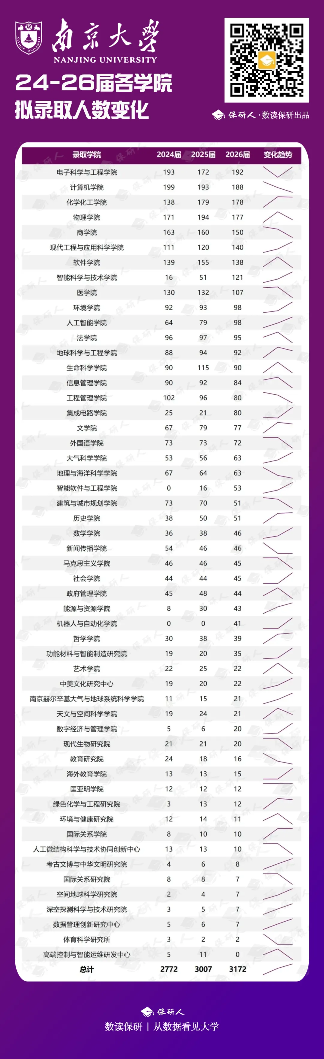 总体规模持续扩大:全校推免录取总人数保持稳定增长,从2024届的2772人增至2026届的3172人,意向南大的保研er机会增多。