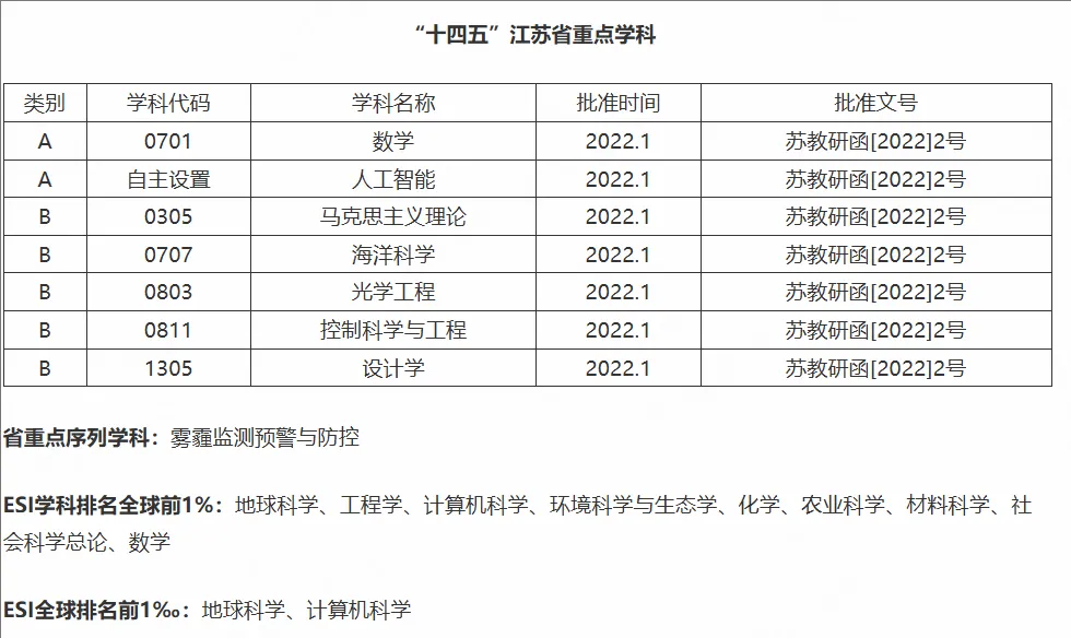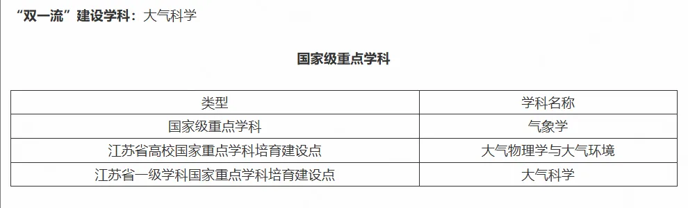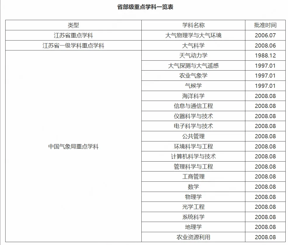 学校办学特色鲜明。大气科学入选国家“世界一流学科”建设学科。气象学为国家重点学科,地球科学、工程学、计算机科学、环境科学与生态学、化学、农业科学、材料科学、社会科学总论、数学、植物学与动物学等10个学科跻身ESI学科排名全球前1%,其中地球科学、计算机科学、环境科学与生态学、工程学4个学科进入前1‰。拥有大气科学、环境科学与工程、信息与通信工程、管理科学与工程、数学、科学技术史、计算机科学与技术、遥感科学与技术、光学工程、网络空间安全、生态学11个一级学科博士学位授权点,电子信息、资源与环境、气象3个博士专业学位授权点,28个一级学科硕士学位授权点、26个硕士专业学位授权点。拥有大气科学、数学、环境科学与工程、管理科学与工程、计算机科学与技术、信息与通信工程等6个博士后科研流动站。86个本科专业(不含专业方向)分布于理、工、文、管、经、法、农、艺、教、交叉10个学科领域。