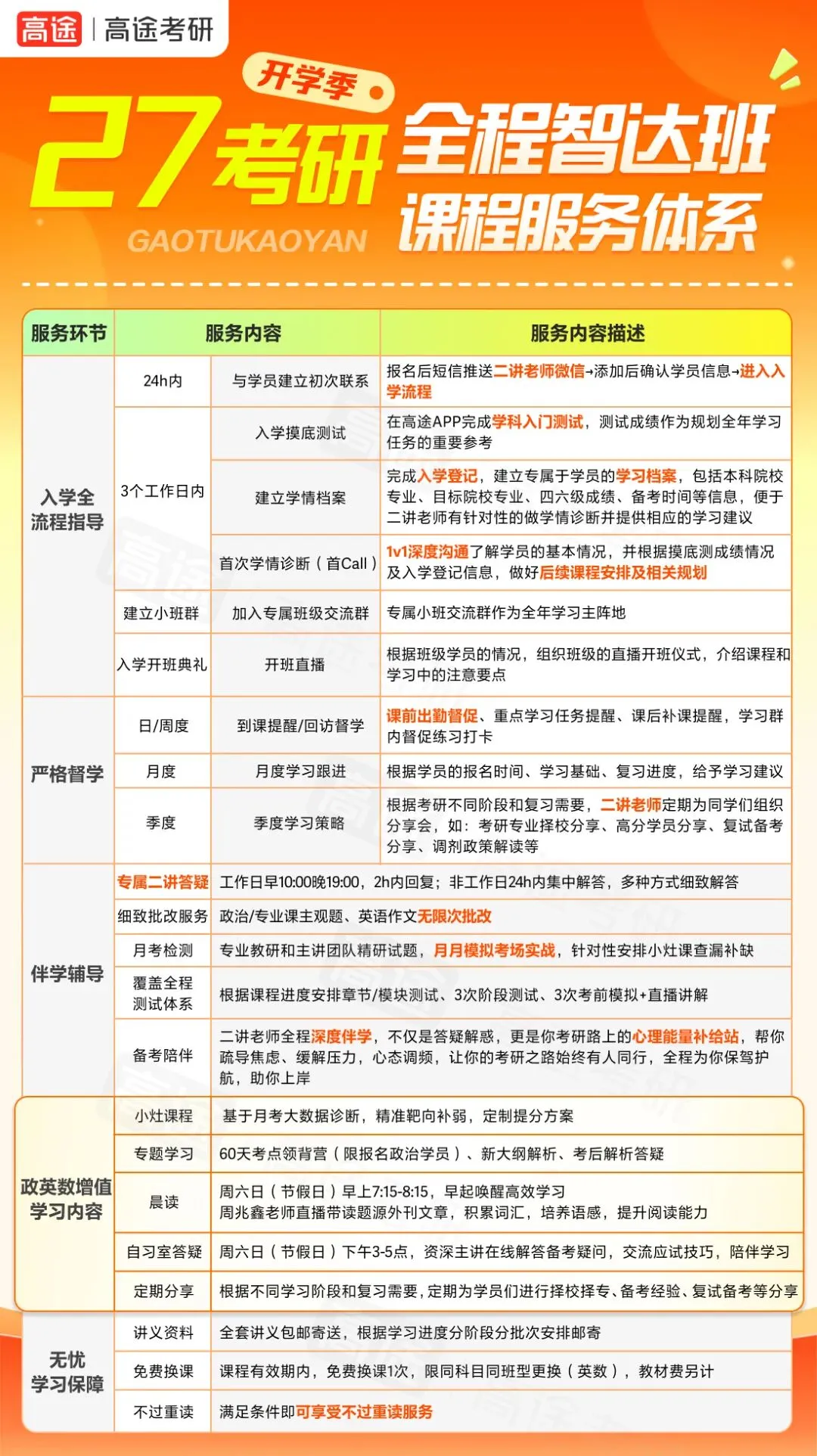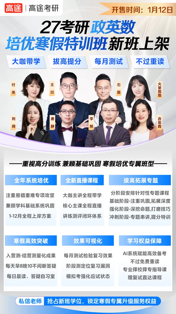 为了帮助大家更好的学习,提高学习效率,高途考研推出了多种课程适配27考研的同学,在这里大家不仅可以享受到专业考研规划咨询讲师帮你选择上岸率更高的学校,更有已经上岸的学长学姐1v1帮大家伴学答疑,选择高途考研,上岸率直接upupup~ 🤣途途在【高途考研】等你哦~