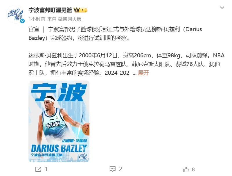 宁波富邦男子篮球俱乐部正式与前广东队锋线外援——达柳斯·贝兹利完成签约,将进行试训期的考察。