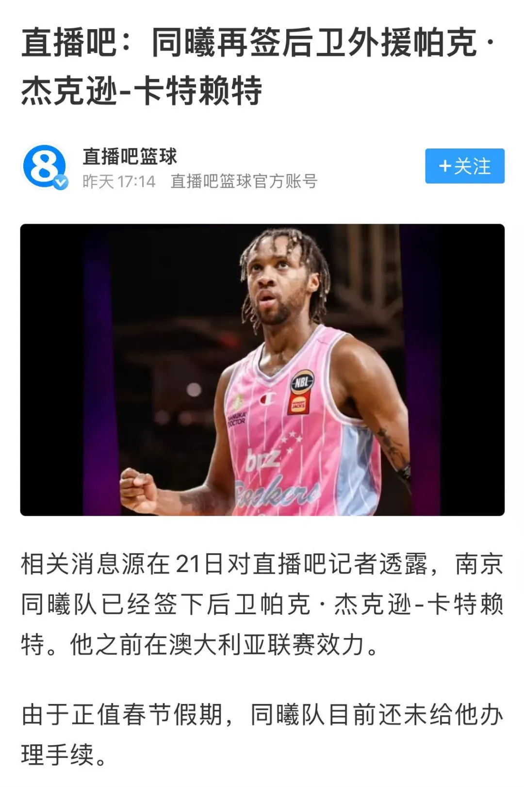 这个窗口期真的有不少CBA球队都盯着澳洲NBL联赛的球员。本来还以为南京同曦队会以三外援的配置打完剩下的比赛,没想到南京同曦队会在窗口期引进第四外援,看来南京同曦队还是想争取再一次打进季后赛。
