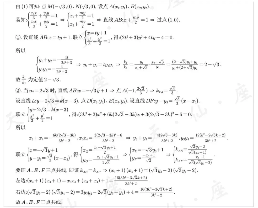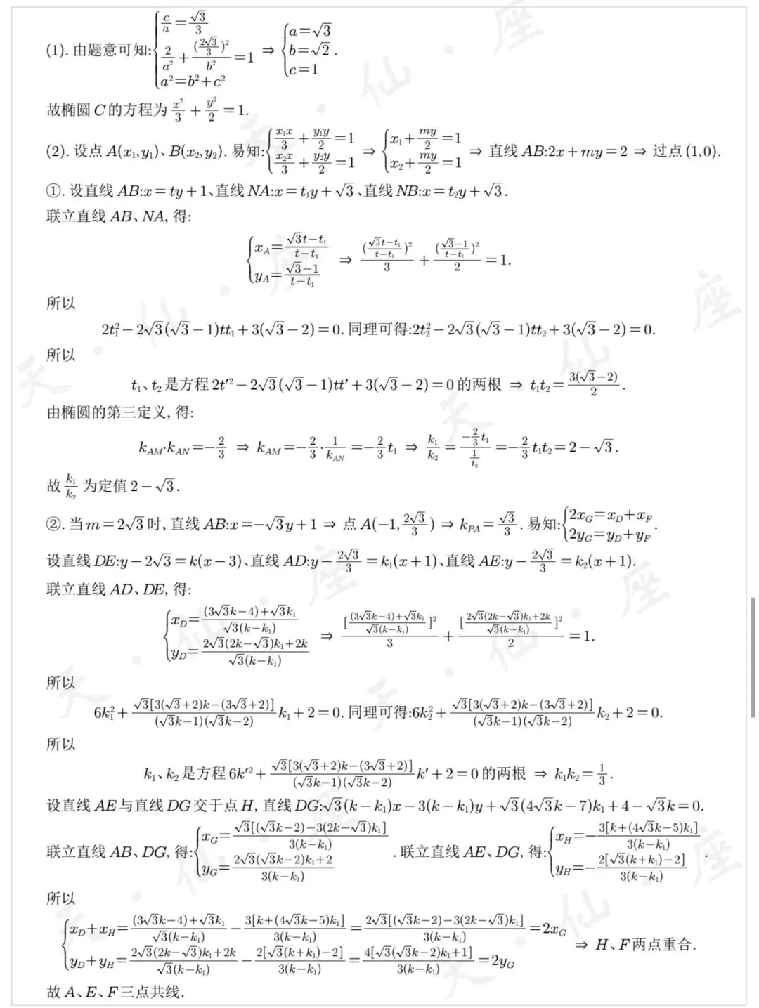 本题还有其他方法,比如三角代换法、定比点差法、向量同构、齐次构造、点差法解点等,这里就不再赘述了,感兴趣的读者可自行尝试。