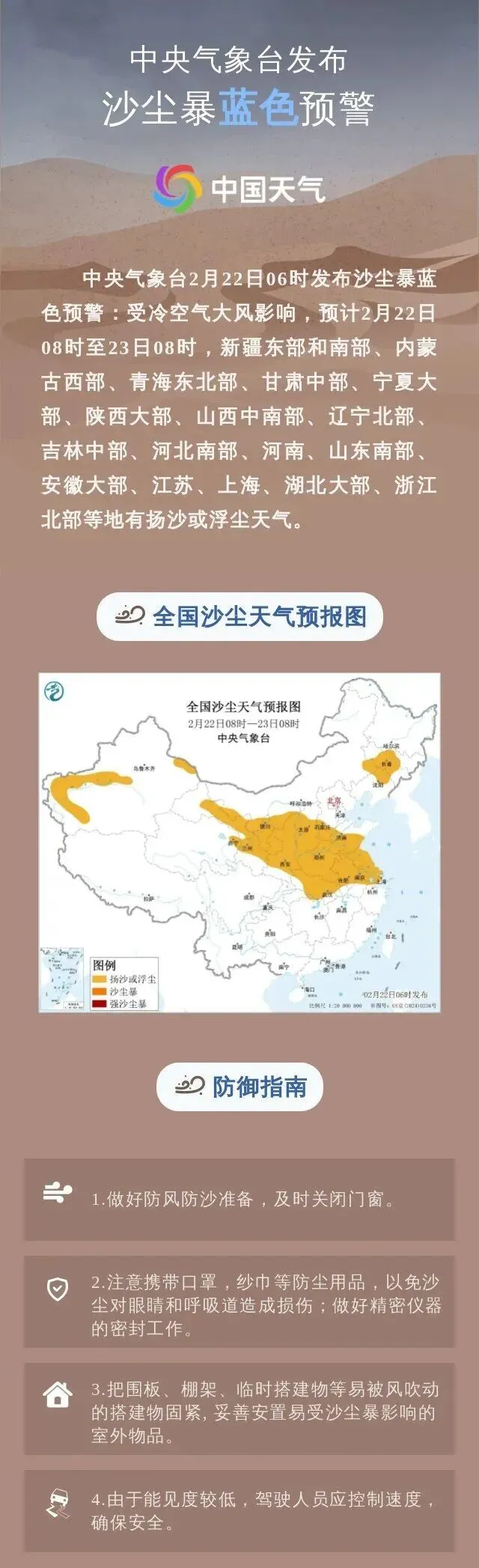 受冷空气大风影响,预计2月22日08时至23日08时,新疆东部和南部、内蒙古西部、青海东北部、甘肃中部、宁夏大部、陕西大部、山西中南部、辽宁北部、吉林中部、河北南部、河南、山东南部、安徽大部、江苏、上海、湖北大部、浙江北部等地有扬沙或浮尘天气。