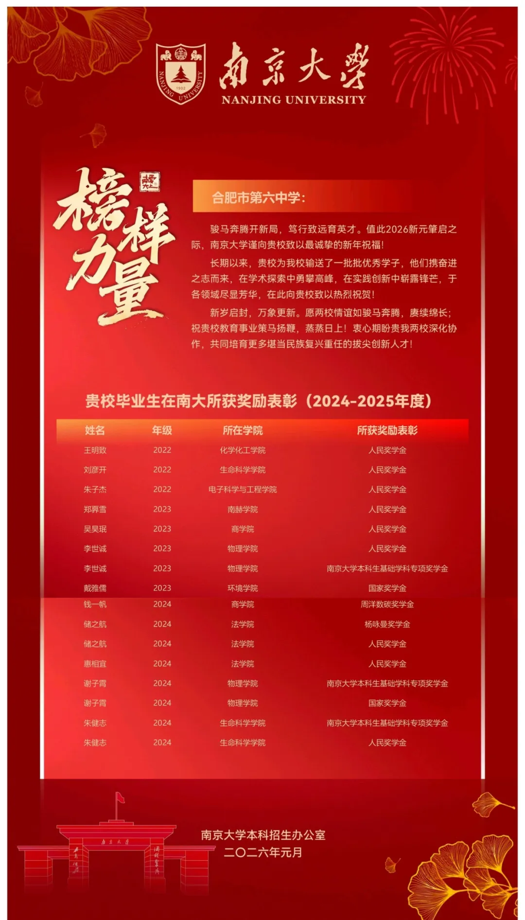 近日,在南京大学发布的《贵校毕业生在南大所获奖励表彰(2024—2025学年度)》中,12位合肥六中毕业生因学习成绩优异、科研潜力突出、综合表现出色,荣获人民奖学金、国家奖学金、南京大学本科生基础学科专项奖学金等多项荣誉。