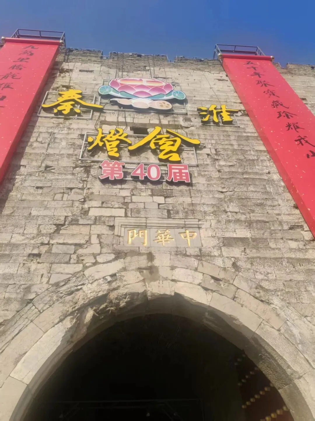 如今的中华门正门,不再是重要的军事基地,而是旅游景点,所以每个人都可以走在正门上。走到正门的前方,会看见印有秦淮灯会第四十届的标识,这次灯会是我三次来南京最美观的一次。