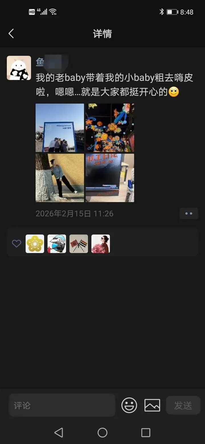 绕了一大圈,饿了,随便找了一家店吃一吃,好像是吃淮扬菜的,为了不侵犯店员肖像权,所以在图中大了马赛克。老徐的手机一边在充电,一边在看抖音,从这场饭局研究🧐表明晚上不去夜游瞻园了,回酒店🏨早点休息了。吃完饭牛哥导航去📍地铁三号线武定门站,欣赏了夜晚的花灯,啊~真美啊!感谢阿梅买的冰棍,时间还早,但步数达到3万多了,早点回酒店休息了,我和老徐还有阿梅现在酒店里休息,因为明天要早起所以牛哥去楼下给我们买早饭吃。明天5点半起,6点半前去明孝陵免门票,老徐闹钟订好了吗?订了5:29,怎么早起,阿梅接受不了,于是牛哥给阿梅买了一张76块的明孝陵门票,随时去。8点钟了,关灯睡觉吧!!!!!在我们玩得热闹的时候,有一位友人还在加班,还记得前几篇游记都有的小鱼吗?也就是我的母亲,她如果不加班,我们就可以一起去南京了,请看她2月14日的朋友圈:谢谢大家的支持,请关注点赞让我们做更好精彩的游记,谢谢!💐💐