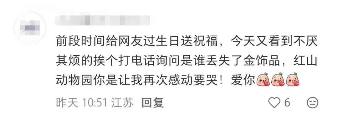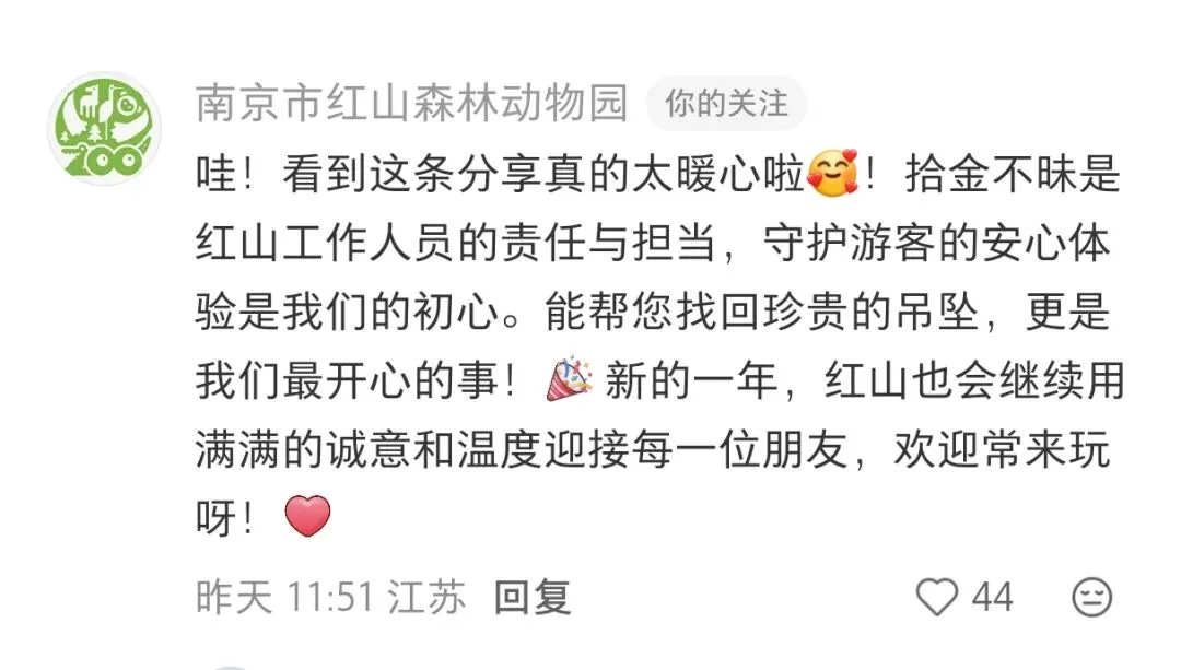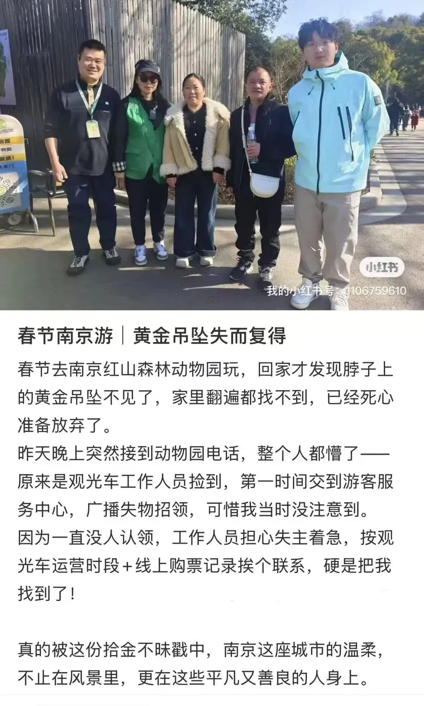 当听说动物园的工作人员为金吊坠“寻主”的故事后,盛女士更是感动不已,“因为一直没人认领,工作人员担心失主着急,按观光车运营时段和线上购票记录挨个联系,硬是把我找到了!中途还交给警察妥善保管,全程认真又负责。真的被这份拾金不昧戳中,南京这座城市的温柔,不止在风景里,更在这些平凡又善良的人身上。今天我就要回泰州了,丢失黄金吊坠失而复得,让我的南京之行没有遗憾。南京很暖,下次我还要再来!”
