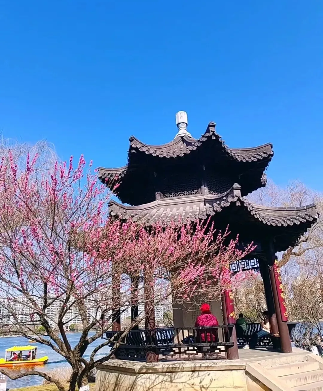 现在的莫愁湖真的是一步一景!从北门进来,沿着湖边慢慢走,目前正值2月底到3月初,除了少量的梅花收尾,最引人注目的就是陆续绽放的玉兰花了 。