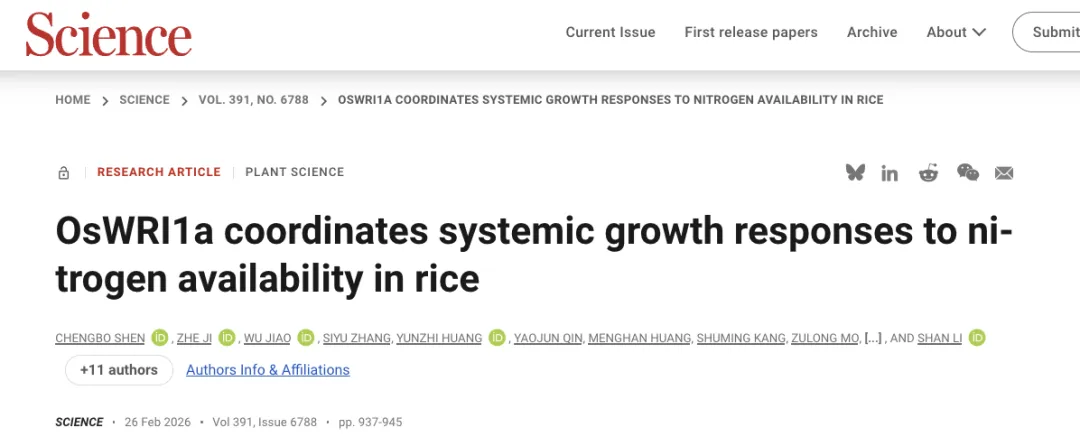 2026年2月26日,Science杂志在线发表了来自南京农业大学李姗教授团队联合中国科学院遗传与发育生物学研究所傅向东院士和英国牛津大学吉喆博士题为"OsWRI1a coordinates systemic growth responses to nitrogen availability in rice"的研究论文。该研究揭示了转录因子OsWRI1a如何作为关键协调因子,整合水稻地上与地下部分对氮素供应的生长响应。这一发现破解了植物界存在逾一个世纪的全株性生长调控之谜,为理解作物如何优化氮素利用效率提供了全新的理论框架,具有重要的基础生物学与农业应用价值。