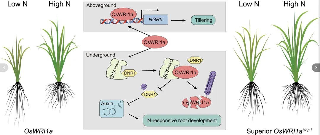 进一步的研究显示,在根系中,OsWRI1a与RNR10蛋白发生相互作用,干扰RNR10与DNR1的结合,进而影响DNR1的稳定性及生长素积累。具体而言,低氮条件下DNR1转录弱、RNR10积累减少,根系生长素水平升高,促进根系伸长;高氮条件下DNR1被稳定,根系生长受到适度抑制。最终,研究表明OsWRI1a通过地上与地下两条平行通路,协调水稻全株对氮素供应的系统性生长响应。