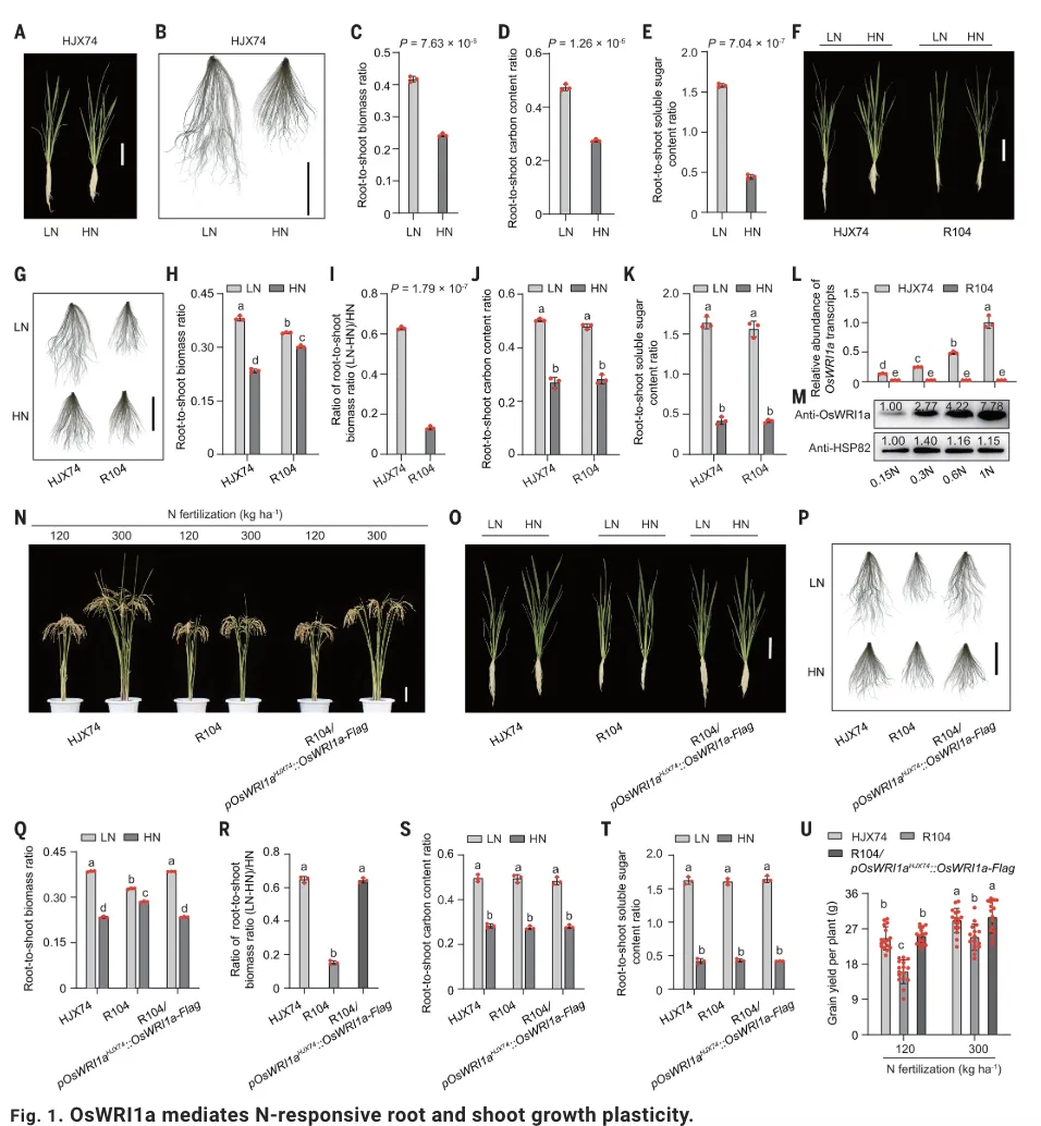 在20世纪绿色革命期间,半矮化水稻品种的引入显著增强了作物的抗倒伏能力,并使其能够适应高氮肥投入的生产模式,从而大幅提升了粮食产量。然而,这类品种往往伴随着较低的氮素利用效率。随着化肥过度使用带来的环境问题日益凸显,培育在低氮条件下仍能维持高产的新品种成为可持续农业发展的关键挑战。植物在低氮条件下会促进根系生长以增强养分吸收、抑制地上部分生长;在高氮条件下则呈现相反趋势。这种根-冠生长分配的动态平衡,是植物优化氮素获取与利用的重要生理基础,也与氮素利用效率密切相关。尽管该现象早已被观察,其背后的分子调控机制却长期不明。