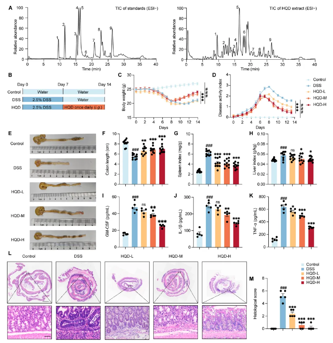 Figure 1展示了黄芩汤(HQD)对DSS诱导的实验性结肠炎的保护作用。通过HPLC-MS/MS鉴定了HQD的主要化学成分(包括芍药苷、黄芩苷、甘草酸等)。在2.5% DSS诱导的结肠炎小鼠模型中,HQD中、高剂量组显著改善了体重下降和疾病活动指数(DAI),缓解了结肠缩短,降低了脾脏和肝脏指数。组织学分析显示HQD明显减轻黏膜损伤和炎症细胞浸润。ELISA结果表明HQD显著降低了血清中GM-CSF、IL-1β和TNF-α等促炎因子水平,证实HQD具有显著的抗炎效果。