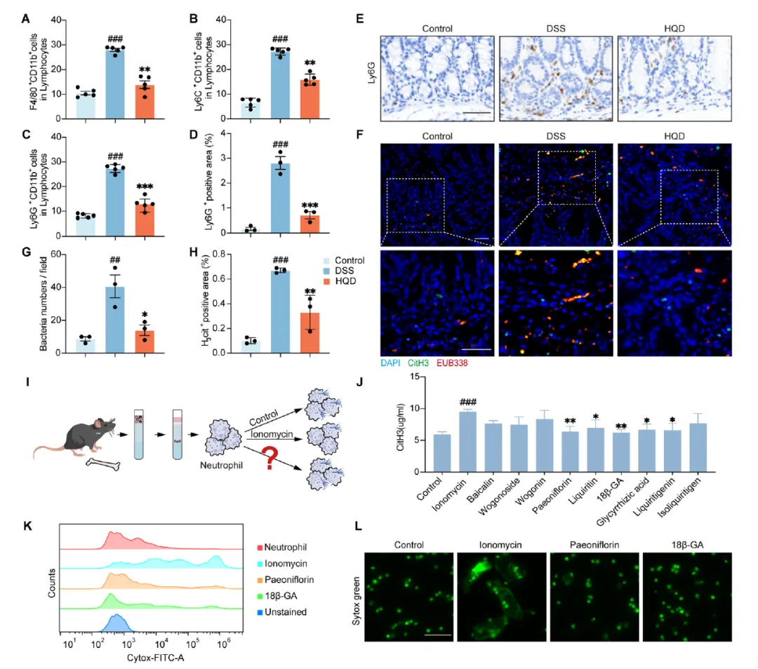 Figure 2探讨了HQD对中性粒细胞介导的结肠炎症的抑制作用。流式细胞术分析显示HQD显著减少了结肠组织中巨噬细胞、单核细胞和中性粒细胞的浸润,其中对中性粒细胞的抑制最为明显。免疫组化证实HQD降低了Ly6G+中性粒细胞的浸润。免疫荧光结合FISH技术发现DSS组中CitH3(NETosis标志物)与肠道细菌共定位显著增加,而HQD处理后明显减少。体外实验表明,HQD成分芍药苷和18β-甘草次酸能有效抑制离子霉素诱导的中性粒细胞NETosis形成。