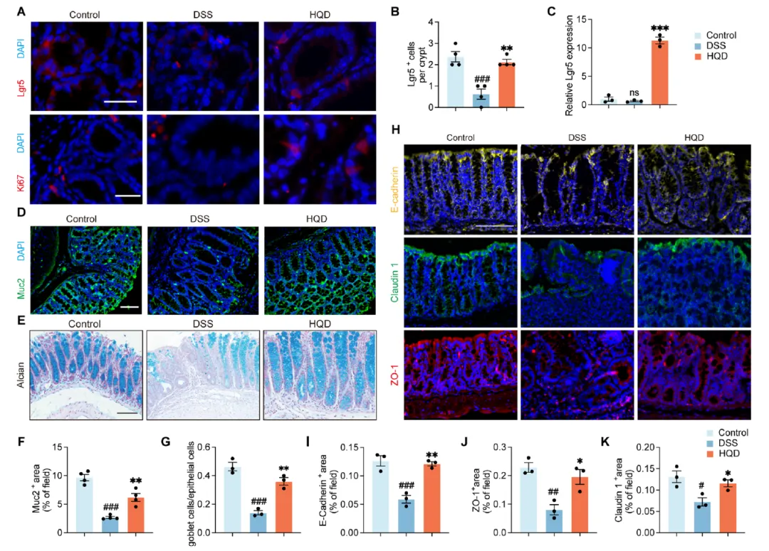 Figure 3研究了HQD对肠道上皮再生和屏障修复的促进作用。免疫荧光结果显示DSS损伤了Lgr5+肠道干细胞,而HQD恢复了其增殖能力(Ki67+),且未引起上皮细胞的恶性增殖。HQD还挽救了DSS损伤的Muc2+杯状细胞和黏液分泌(Alcian蓝染色)。此外,HQD显著上调了紧密连接蛋白ZO-1、E-cadherin和Claudin-1的表达,增强了肠道屏障功能,提示HQD通过促进肠道干细胞介导的再生修复结肠黏膜。