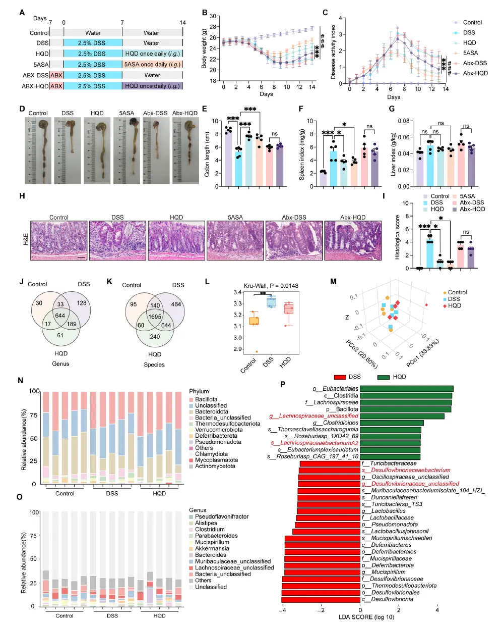 方法:采用DSS诱导的结肠炎小鼠模型评估HQD的作用。通过临床疾病指数、组织学分析和细胞因子水平评估结肠炎的严重程度和炎症情况,并通过宏基因组测序分析肠道微生物群特征。我们使用机制性实验评估特定菌株对肠类器官和中性粒细胞NETosis的影响。