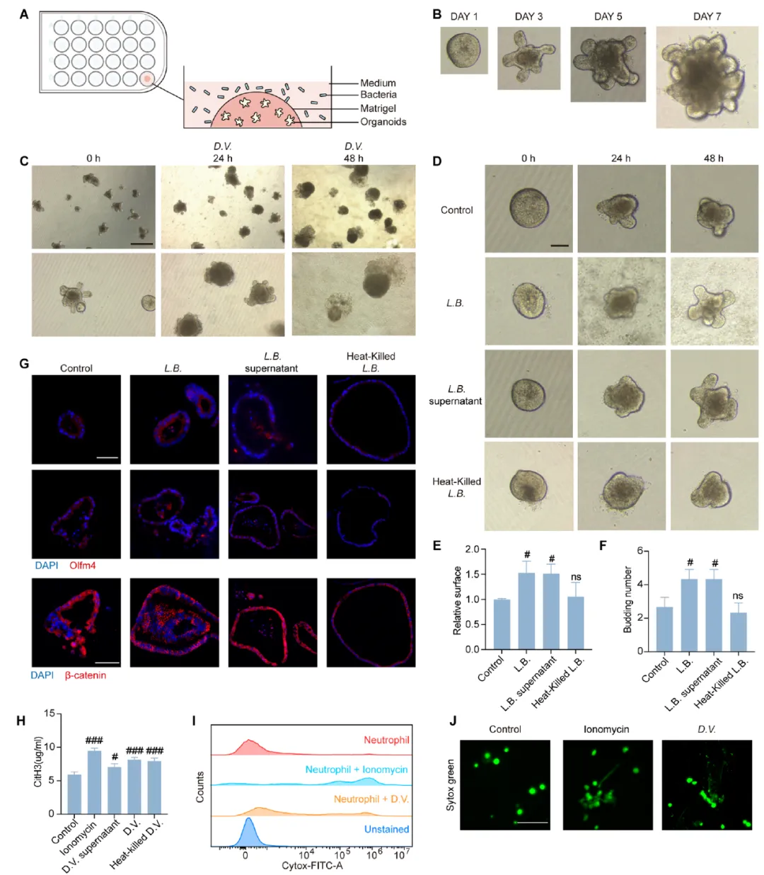 5. 体外机制验证:建立小肠类器官培养体系,分别与脱硫弧菌科(D.V.)和毛螺菌科(L.B.)共培养,评估菌株对类器官生长、干细胞标志物(Olfm4、β-catenin)及Wnt信号通路的影响;分离骨髓中性粒细胞,检测不同菌株及黄芩汤活性成分对NETosis的诱导或抑制作用。