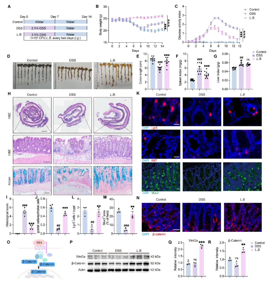 6. 菌群功能验证:采用抗生素清除实验验证黄芩汤疗效的菌群依赖性;通过单独灌胃L.B.(1×10⁸ CFU)验证其对结肠炎的治疗作用及Wnt/β-catenin信号激活效应。