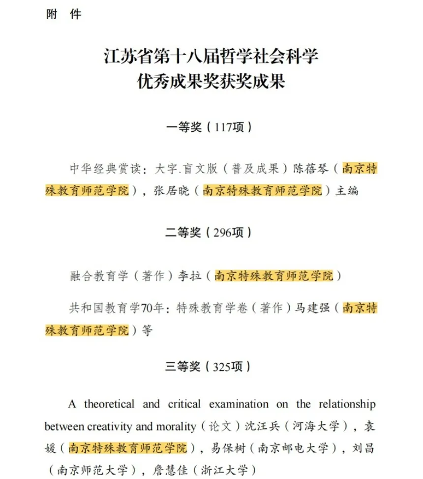 近日,江苏省人民政府正式印发《省政府关于公布江苏省第十八届哲学社会科学优秀成果奖的决定》(苏政发〔2025〕106号),我校4项成果成功上榜,更是实现普及成果类一等奖的历史性突破,彰显了我校在特殊教育领域研究的强劲实力与鲜明优势。陈蓓琴研究员、张居晓教授团队编撰的读物《中华经典赏读:大字·盲文版》荣获普及成果类一等奖;李拉教授的著作《融合教育学》,马建强教授的著作《共和国教育学70年:特殊教育学卷》等2项成果荣获二等奖;袁媛副教授参与的论文《A theoretical and critical examination on the relationship between creativity and morality》荣获三等奖。