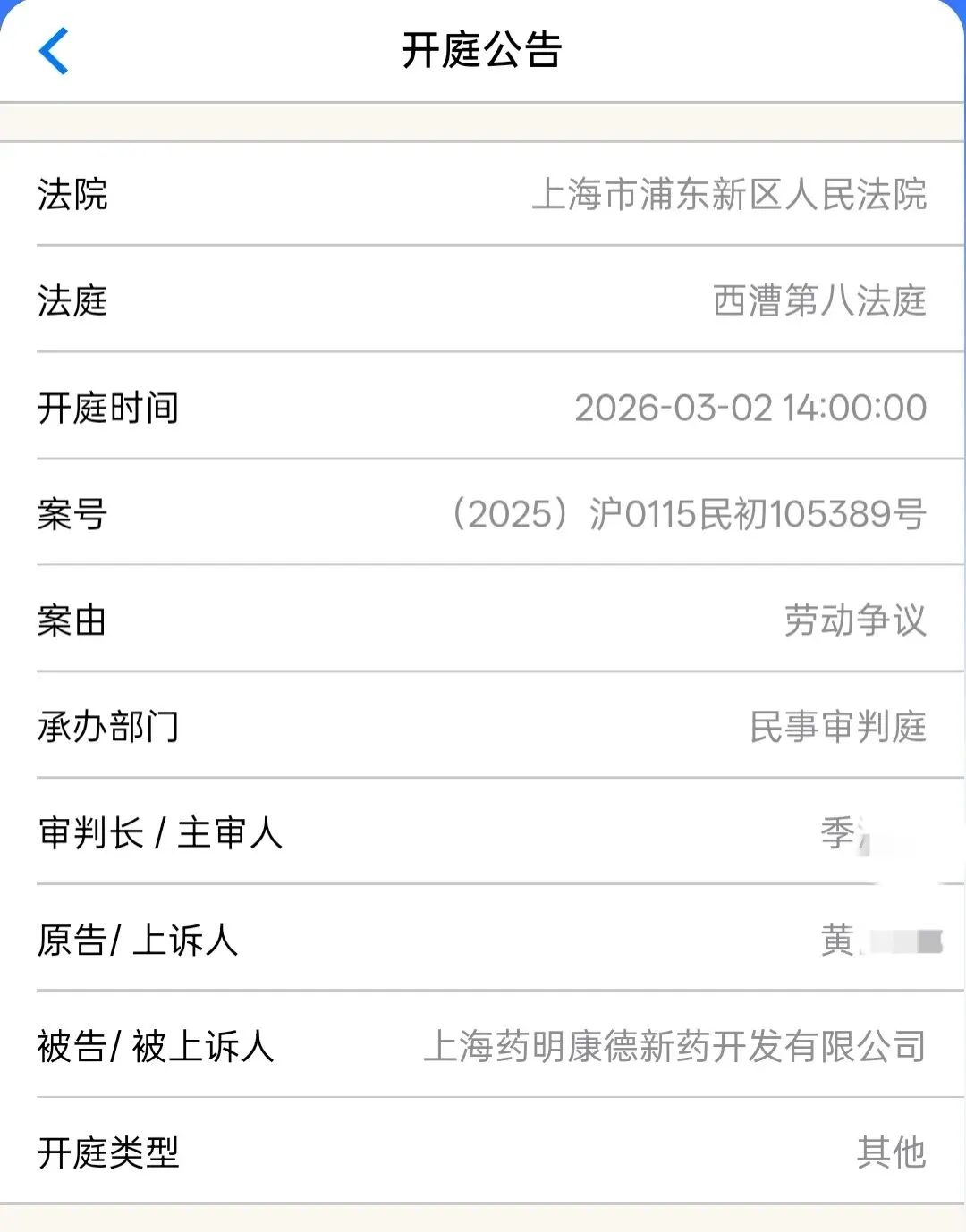 上海药明康德新药开发有限公司因劳动争议被起诉,案件将于2026年3月2日14点在上海市浦东新区人民法院西漕第八法庭开庭审理,地址为浦东新区杨源路218号西漕大楼。