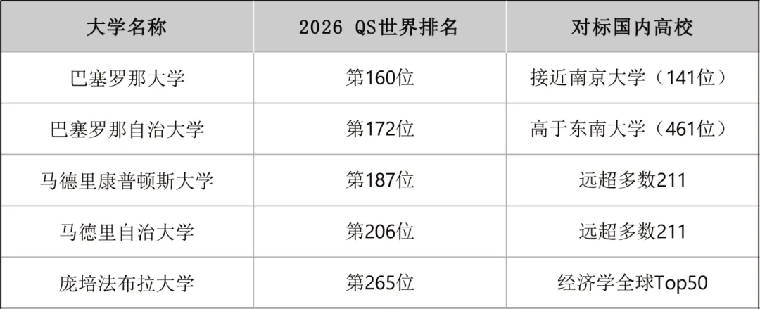 简单说:620分的高考成绩,在国内可能在一本线上徘徊;在西班牙,可以进入世界排名前200的大学——这些学校的国际认可度,不输国内211,甚至比肩部分985。