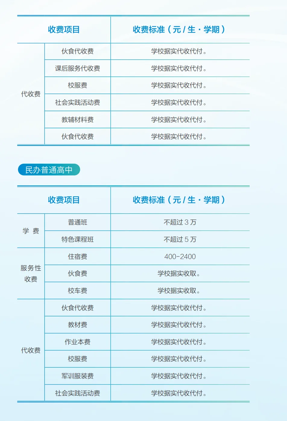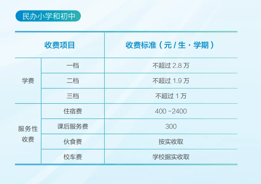 其中民办小学、初中学费最高不超过 2.8 万元 / 生・学期,民办普通高中特色课程班学费最高不超过5万元 / 生・学期,另有4所民办学校纳入收费市场化改革试点,可自主制定学费及住宿费标准。