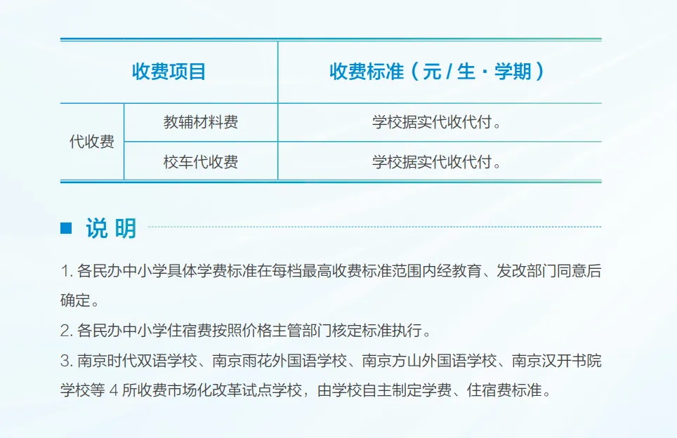 南京时代双语学校、南京雨花外国语学校、南京方山外国语学校、南京汉开书院学校 4 所学校,纳入收费市场化改革试点范围,可自主制定学费、住宿费标准。