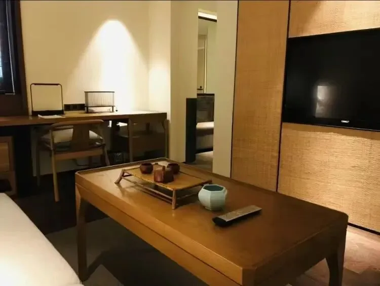 芥子园63间客房里,木茶几、木柜、镂空木门的运用,营造出天然的舒适感。新中式风格的床铺、沙发,又增添了几分现代感。