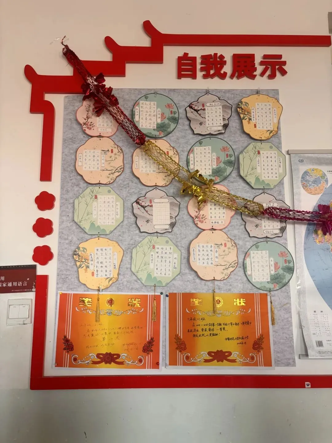 这栋楼后面,右边他们的小菜园-幸福农庄;里面有白菜、蒜苗、菠菜等,这些都是自己带的种子播种的;左边有两栋教学楼,有点旧那栋是四年级至六年级上课的地方,李颢宇带我参观了他的教室,进入教学楼,映入眼帘的是“为党育人,为国育才”八个大字,楼梯上有四大名著等介绍,他们教室里前面有“自我展示”是一些书法不错的同学写作品,其中就有李颢宇,接着是世界地图和中国地图,然后是“班级风采”是一些美术作品,后面是荣誉墙,李颢宇成绩排名第四,荣登光荣榜,然后是黑板报和读书角,我们坐下来聊了会天,交流了一下学习经验,使我受益匪浅。