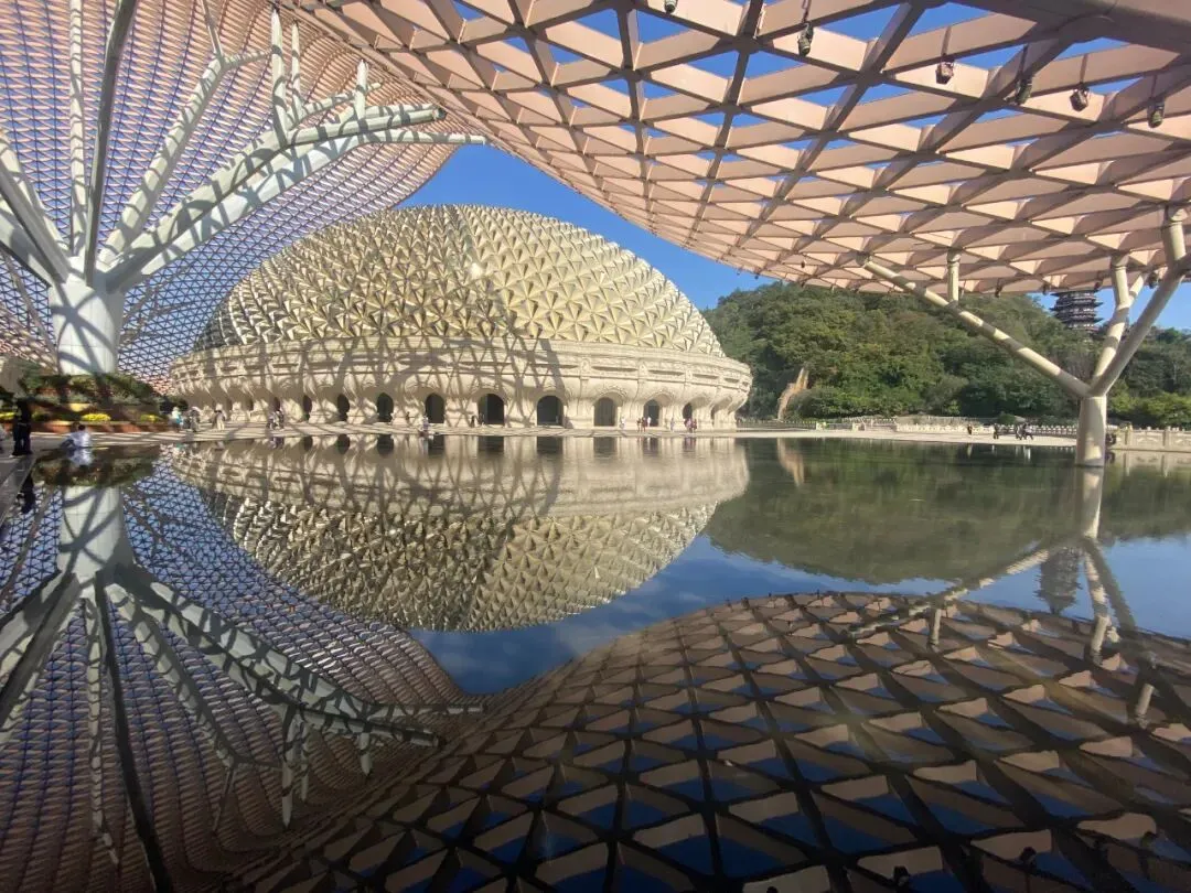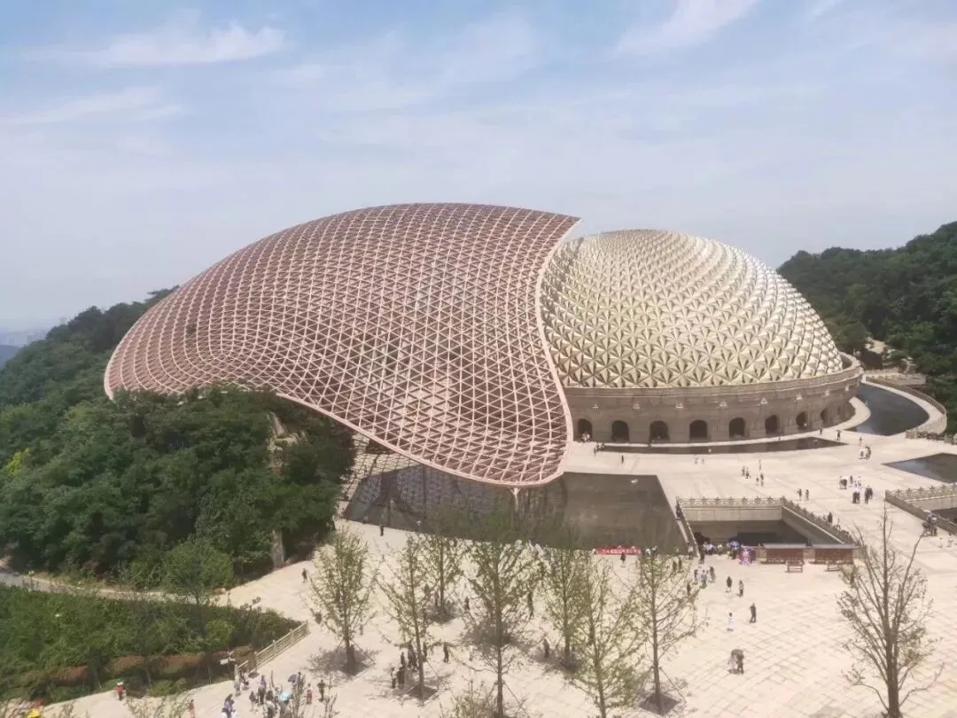 从远处眺望,牛首山的标志性建筑 —— 佛顶宫便以极具冲击力的姿态闯入视野。巨大的穹顶如莲花般舒展。