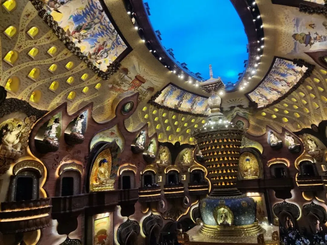 抬头仰望,穹顶的钢结构如蛛网般交织,与暖黄的灯光、层层叠叠的佛龛相映成趣,每一处细节都在诉说着匠心与虔诚。