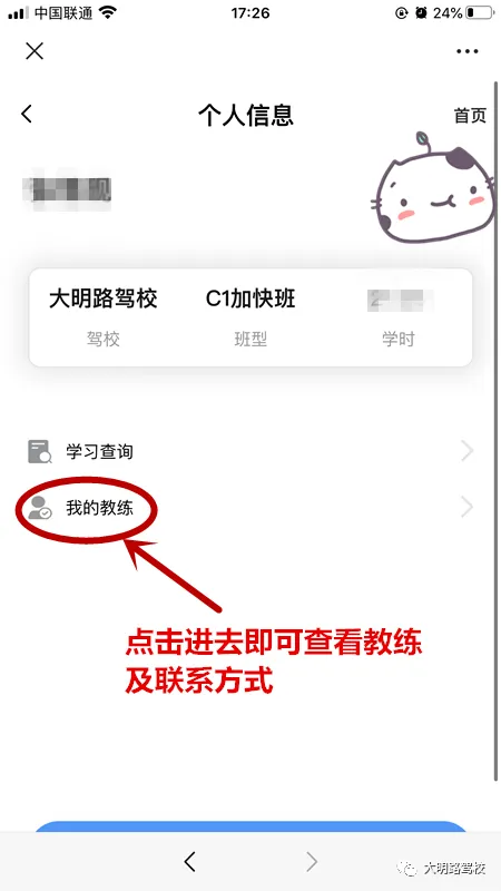 点击"我的教练"即可查看教练及其联系方式