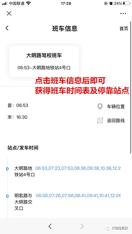 点击班车信息即可看到驾校班车所有时间点及停靠点