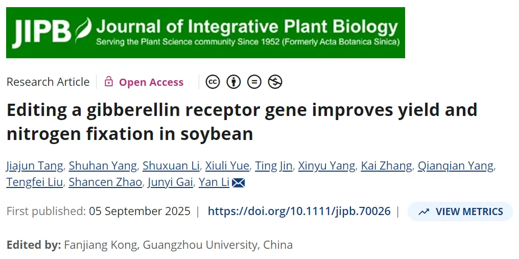 JIPB以封面文章在线发表了南京农业大学李艳教授团队最新的研究论文,题为“Editing a gibberellin receptor gene improves yield and nitrogen fixation in soybean”。
