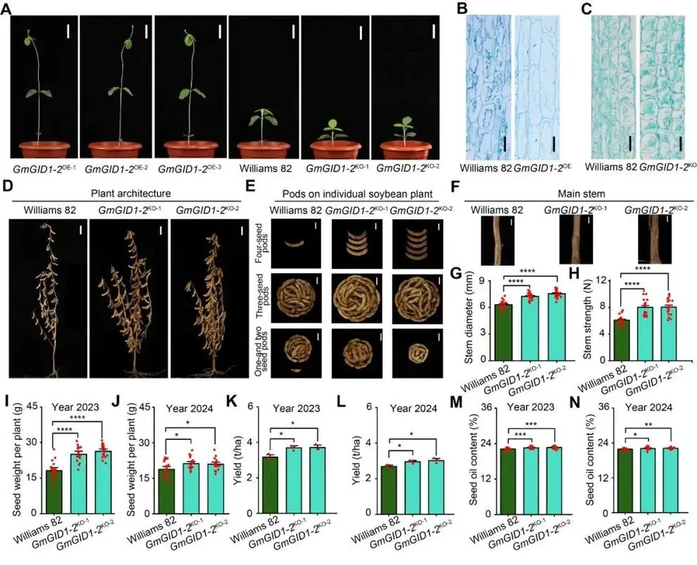 该研究通过CRISPR/Cas9技术敲除大豆赤霉素受体基因GmGID1-2,发现该基因的敲除可显著降低株高、增加茎粗和分枝数,提升单株荚数和籽粒数,从而提高产量和种子含油量。同时,GmGID1-2的敲除还显著增强了根瘤数量、重量及固氮酶活性,提高了植株氮素含量,为大豆绿色革命提供了新的基因资源。