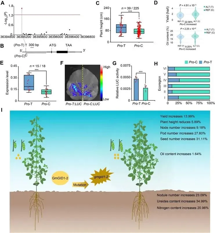 分析GmGID1-2的自然变异发现,在课题组264份大豆资源及大豆公共数据库中,其编码区均未鉴定到导致基因功能丧失或氨基酸变化的序列变异;而启动子区局部关联分析发现,Gm_36396036位点与大豆株高显著关联。该位点将GmGID1-2启动子分为Pro-C和Pro-T两种类型,其中,Pro-C型启动子的大豆株高更矮、产量和种子含油量更高,且GmGID1-2基因表达量更低,与GmGID1-2敲除株系表型一致。在Pro-C优异单倍型的遗传背景下敲除GmGID1-2,可进一步提高大豆的产量、种子含油量和根瘤固氮。