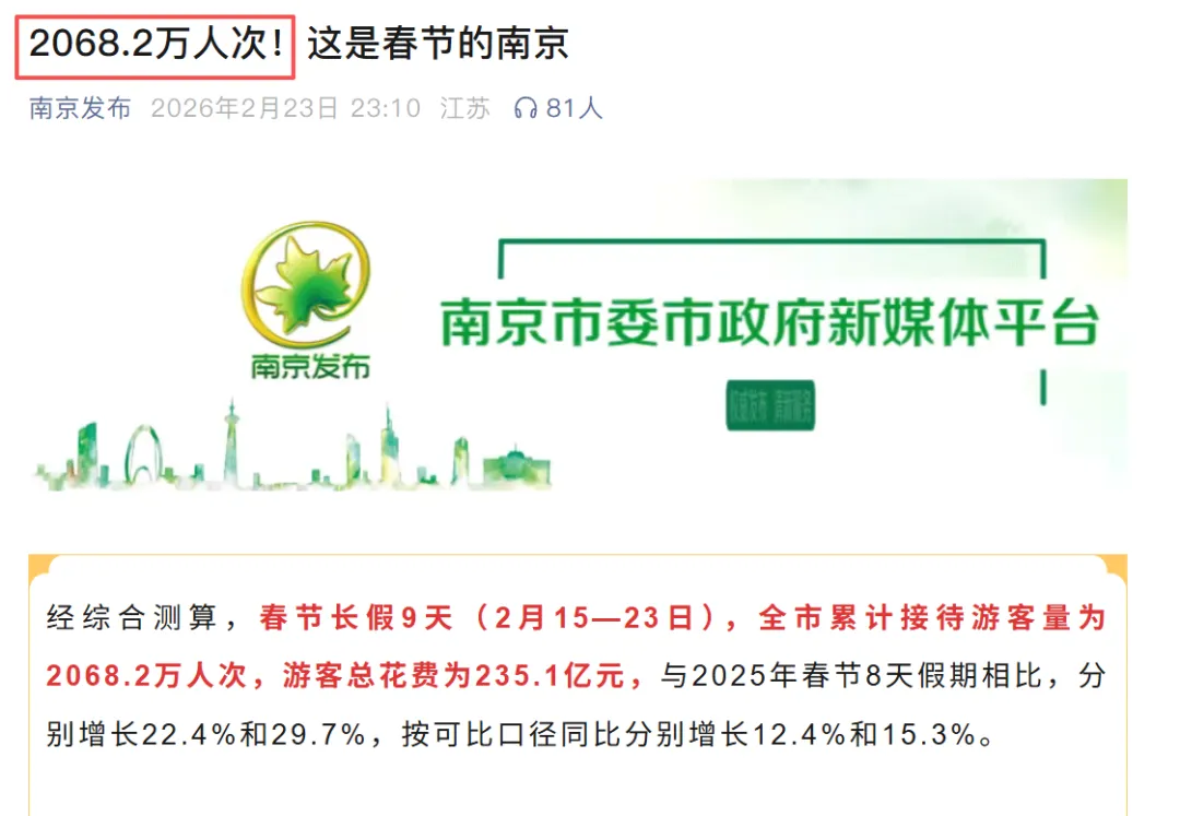 2月23日,春节假期最后一天,“南京发布”公众号公布假期游客数据: