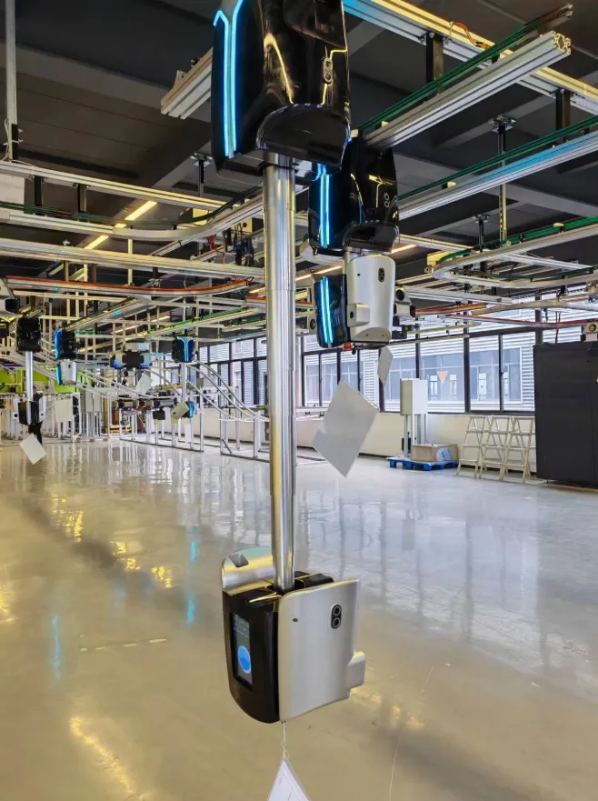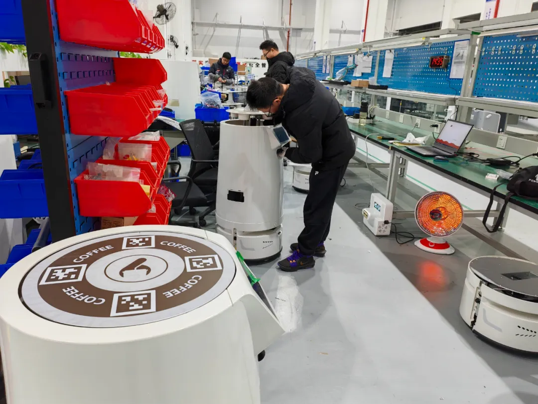 一旁的装配区,几名工程师正在对着几个“小白”一顿操作,从面板调试到线路对接,每个环节都一丝不苟。这些“小白”正是集萃智造全球首创智送一体咖啡机器人中的组成部分——无人车。