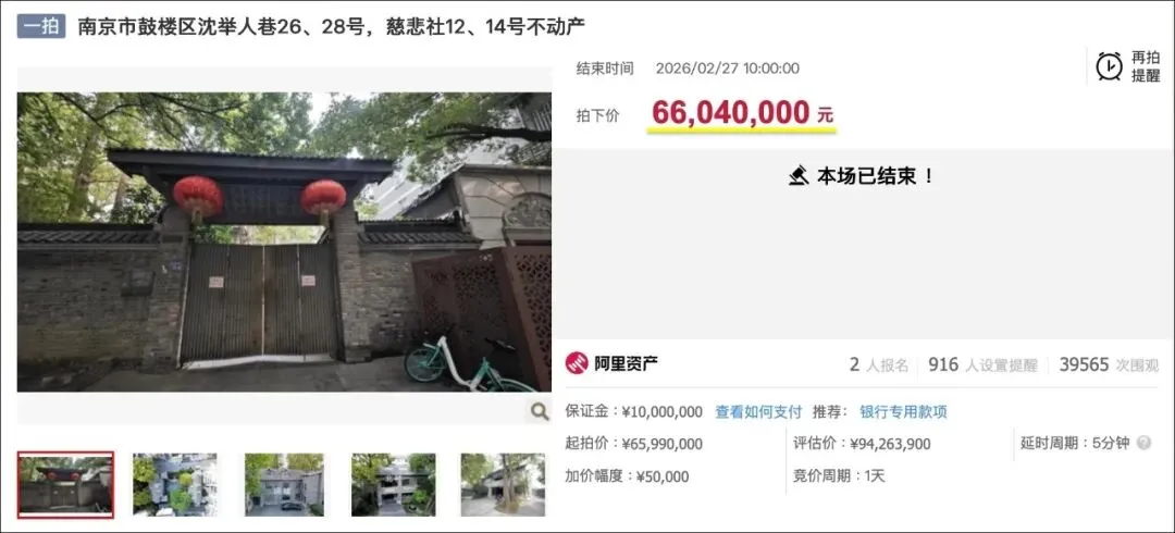 作为南京知名民国别墅,张治中公馆市场评估价超9426万,起拍价6599万,吸引近4万人次围观。