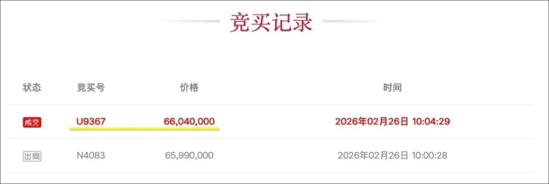 一共2人报名竞拍,经过2轮竞价,加价5万,最终被编号为U9367的雷姓买家竞得,成交总价6604万。
