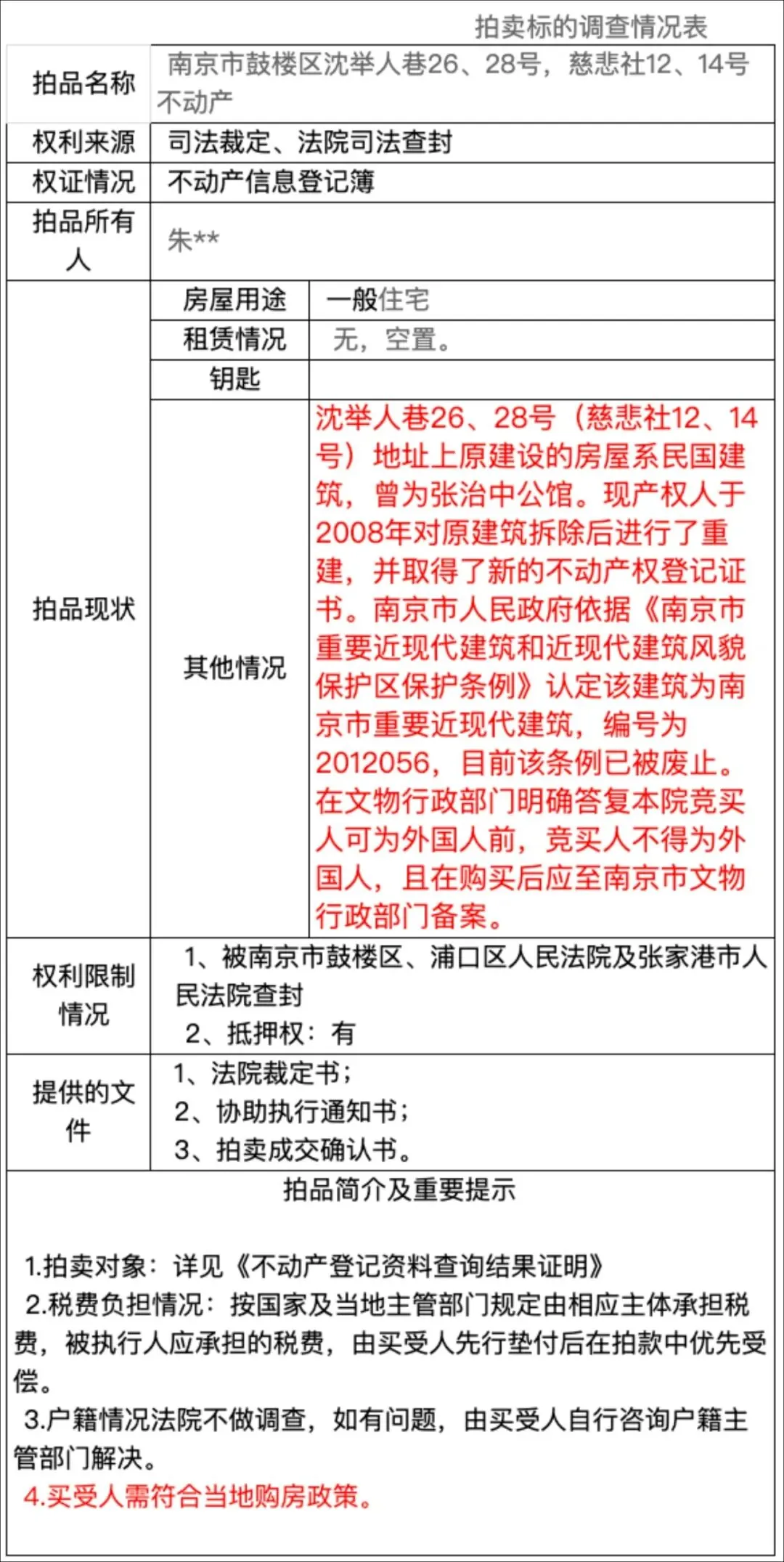 根据拍卖标的情况表显示,沈举人巷26、28号(慈悲社12、14号)地址上原建设的房屋系民国建筑,曾为张治中公馆。