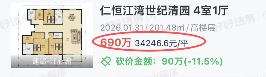 城东中海钟山印,205㎡的大户型也就1.3万/㎡;仁恒江湾世纪 201㎡,如今也是3.4万/㎡成交。