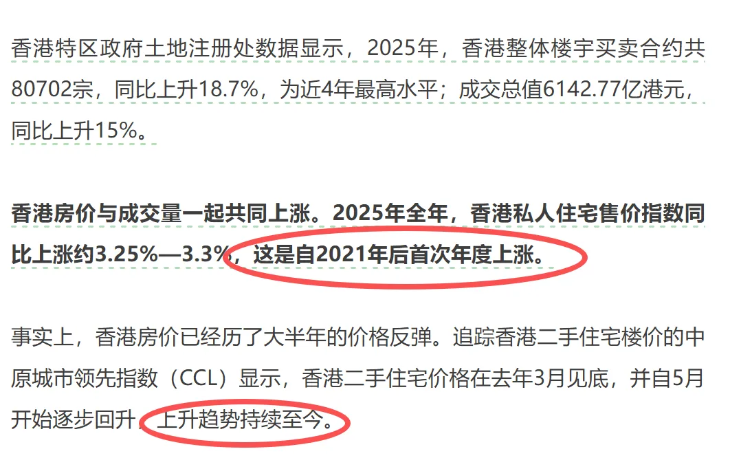 最新数据,2025年全年,香港私人住宅售价指数同比上涨约3.25%—3.3%,这是自2021年后首次年度上涨。