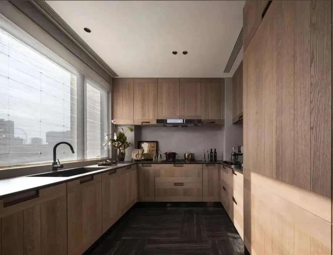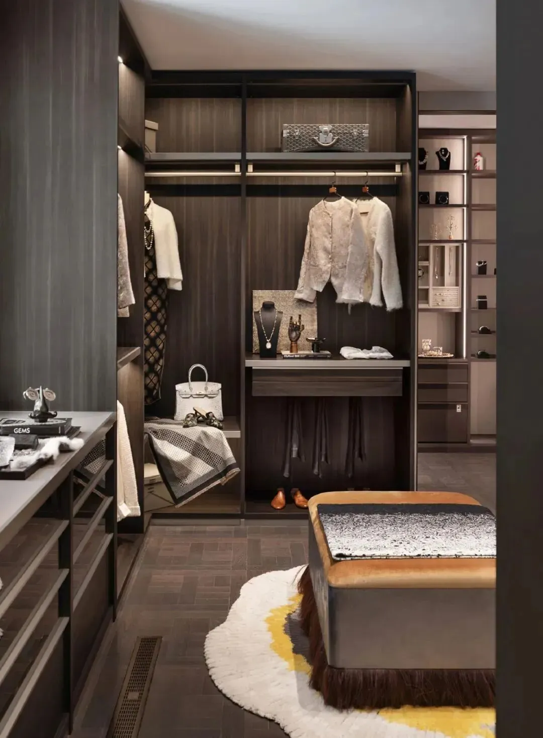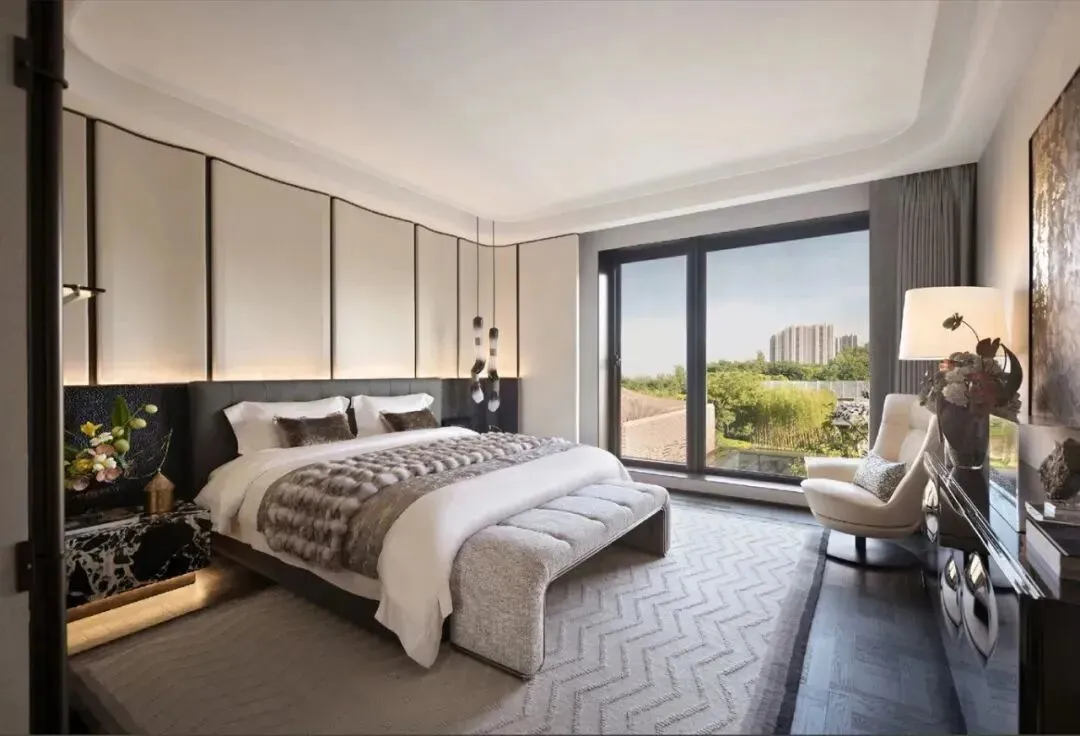 主卧空间巧妙平衡了现代审美与中古韵味,将不同时代的风格元素和谐共纳。深浅色块的搭配清晰地勾勒出功能区域的层次,波浪造型的背景墙与地毯纹路相映成趣,为卧室注入了一种柔和而连续的动态感。