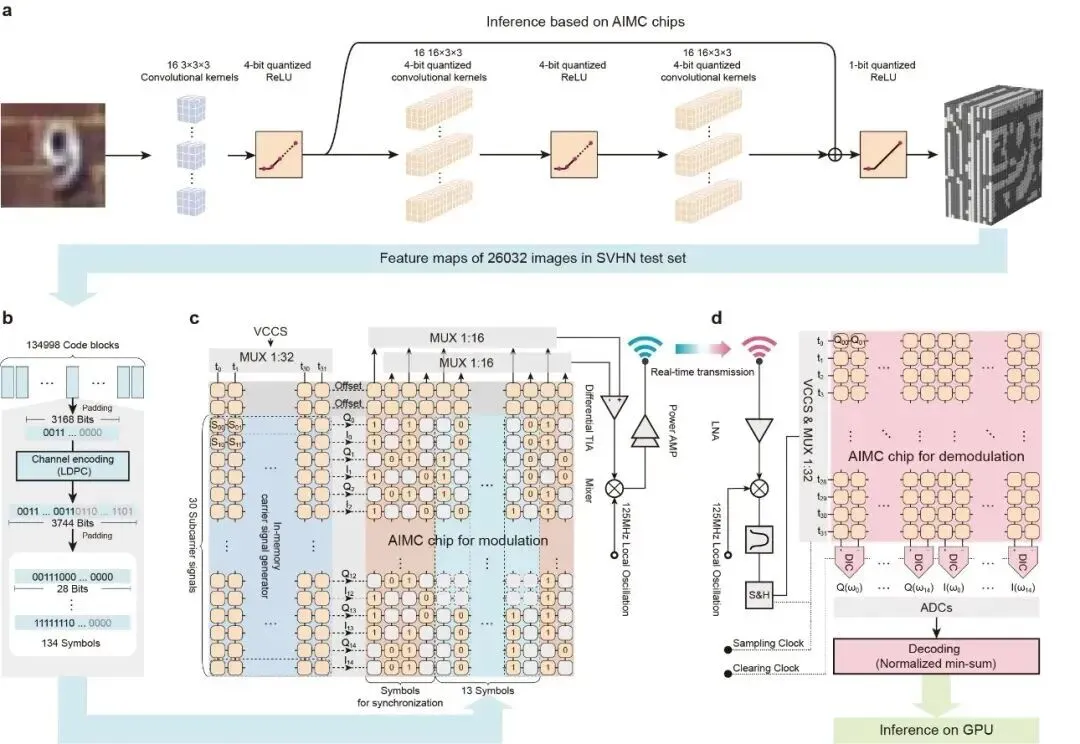 为实现端云无线协同推理,传统方案长期沿用“分层解耦”设计思路,即端侧设备、通信模组、云端设备分别被独立设计并完成任务。然而,这种“自扫门前雪”的设计思路会导致三类“分离”问题叠加放大能耗开销。第一,存储与计算分离使端侧硬件在神经网络推理中频繁搬运数据,能效受限于冯·诺依曼瓶颈;第二,信号处理与收发分离使无线链路依赖高精度模数转换(尤其接收端模-数转换器(ADC))与复杂的数字基带处理,而ADC功耗随精度提高而快速增长,基带处理任务也随编码复杂度快速提升,令低功耗终端难以承受;第三,也是最容易被忽视的一点——神经网络与无线通信分离:神经网络依赖数据训练去“猜测”最有可能的结果,而通信模块通常被要求“无差错”地传输计算数据。为保证通信的“无损性”往往需要更高的信噪比(更高精度射频链路、更大发射功率)、更低码率编码方式与更复杂的解码链路,从而把无线通信成本推到很高。