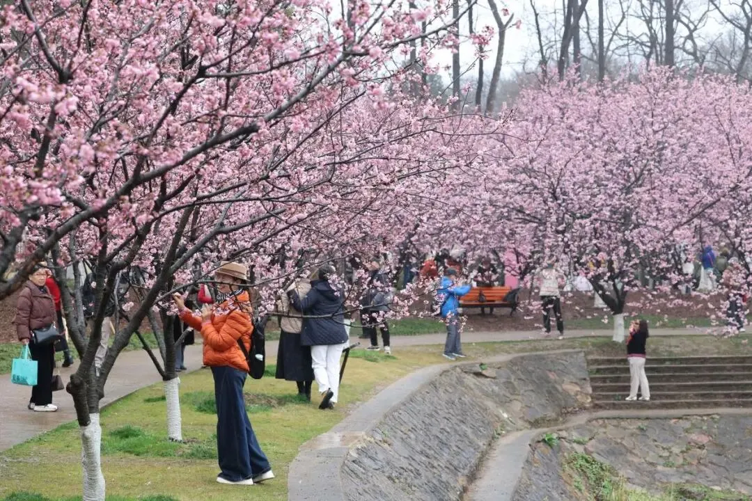 春有信,花不误。乍暖还寒的时节,满城春意已悄然跃上枝头。2月27日上午,细雨微濛,记者走进南京中山植物园北园樱花大道,瞬间坠入一片浪漫的粉色花海。近两百株樱花临水而立,远观粉白嫣红、如云似霞;春风轻拂,花枝摇曳,湖面倒映花影,宛如一幅灵动的春日油画。