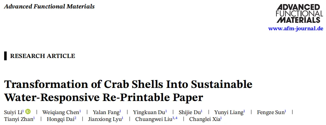 Suiyi Li, Weiqiang Chen, Yalan Fang, el at. Transformation of Crab Shells Into Sustainable Water-Responsive Re-Printable Paper, Advanced Functional Materials, 2026; 0:e27366.
