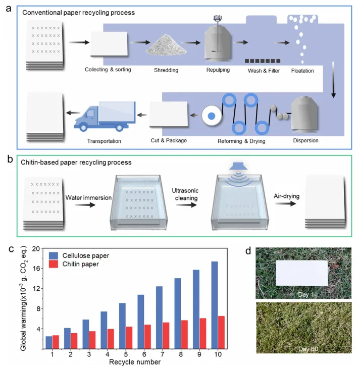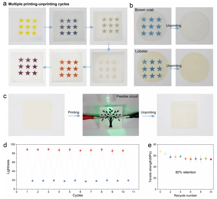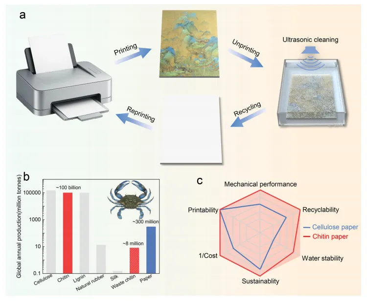 研究以蟹壳为原料制成可循环打印的甲壳素纸,利用水响应脱墨机制,实现1分钟快速脱墨和10次以上循环使用,兼具高性能与生物降解性。