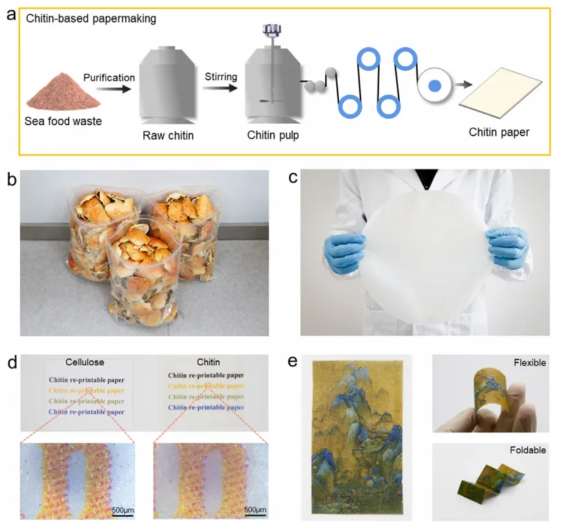 甲壳素作为自然界中含量第二丰富的天然聚合物,广泛存在于蟹壳、虾壳等甲壳类废弃物中,全球每年产生约 800 万吨相关废弃物,却大多被丢弃未被有效利用。甲壳素分子结构中含有的乙酰氨基使其具备良好的水稳定性与氢键作用,但其在造纸领域的应用尚未被充分开发。因此,利用甲壳素制备可重复打印、环境友好的新型纸张,不仅能解决传统纸张的环保问题,还能实现海鲜废弃物的资源化利用,具有重要的科学价值与应用前景。