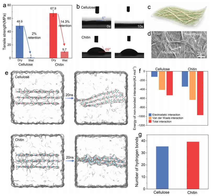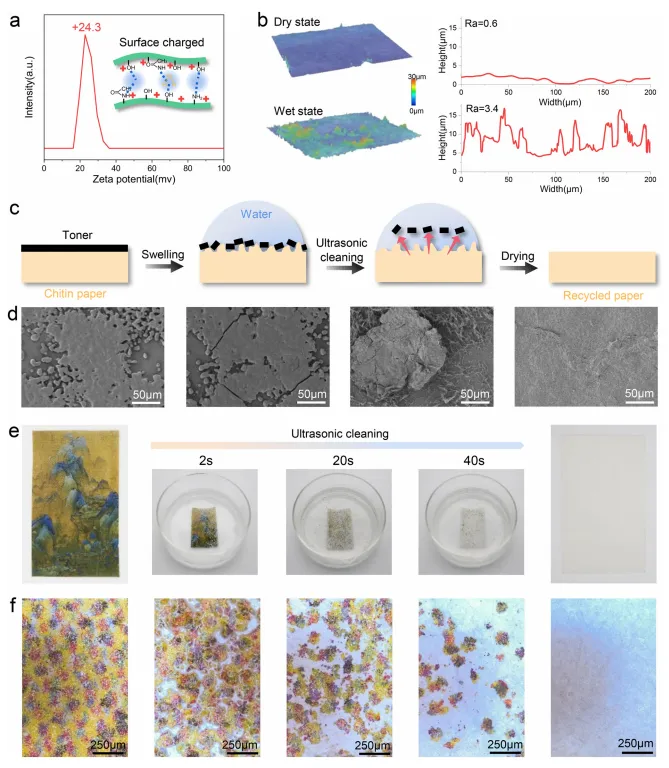 南京林业大学夏常磊教授该研究利用蟹壳为原料,通过简单的“提纯-搅拌-干燥”工艺制备出具有微纳双重网络结构的甲壳素纸,其干/湿拉伸强度远超传统纤维素纸,且兼容商用激光打印,打印质量清晰。其核心创新在于水响应脱墨机制:浸水后纤维水合膨胀与静电排斥破坏墨粉结合,经1分钟超声清洗即可快速脱墨,实现“打印-脱墨-再打印”循环,重复使用10次以上后力学性能保留率达80%,白度几乎无衰减。该回收过程仅需“浸水-超声-晾干”三步,能耗低且2个月内可完全生物降解,为可持续纸张设计和海鲜废弃物资源化利用提供了新路径。