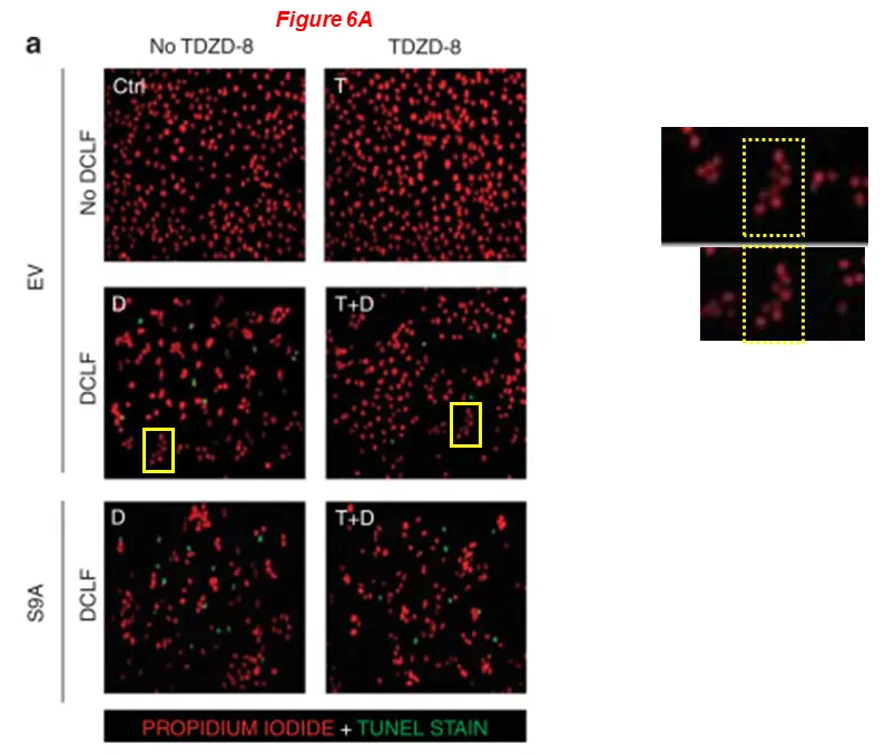 图6A:在显示不同样本的两张显微照片中,一组TKPT细胞看起来完全相同(黄色框内),而周围的其他细胞却不同。这种现象若非经过数字编辑处理是不可能发生的。 作者能否予以说明?